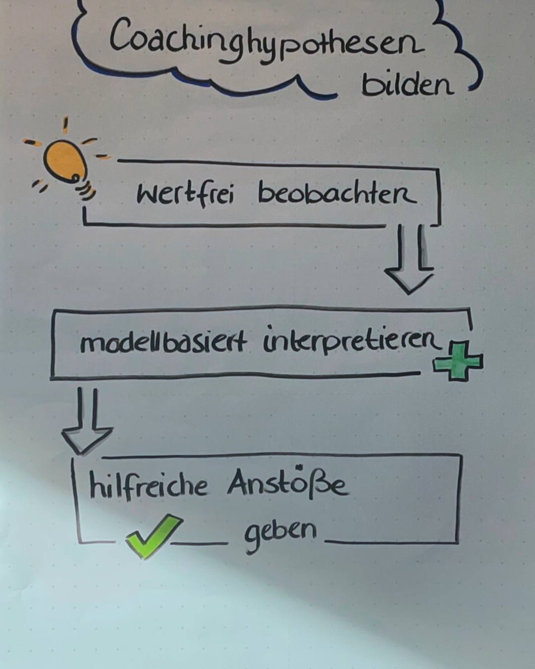 In der Regel nach der Mittagspause geht es dann mit den Themen Coachingprozess und Hypothesenbildung weiter. Denn: Als Coaches müssen wir Beobachtungen und Interpretationen sauber voneinander abgrenzen können. Um das zu lernen seid ihr da.